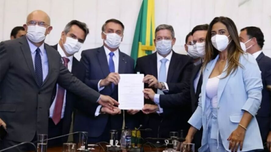 O texto foi entregue pessoalmente por Bolsonaro ao presidente da Câmara, Arthur Lira (PP-AL). O presidente da República foi ao Congresso acompanhado pelos ministros Flávia Arruda (Secretaria de Governo), Ciro Nogueira (Casa Civil), Paulo Guedes (Economia), João Roma (Cidadania), Luiz Eduardo Ramos (Secretaria-Geral), e general Augusto Heleno (Gabinete Segurança Institucional).